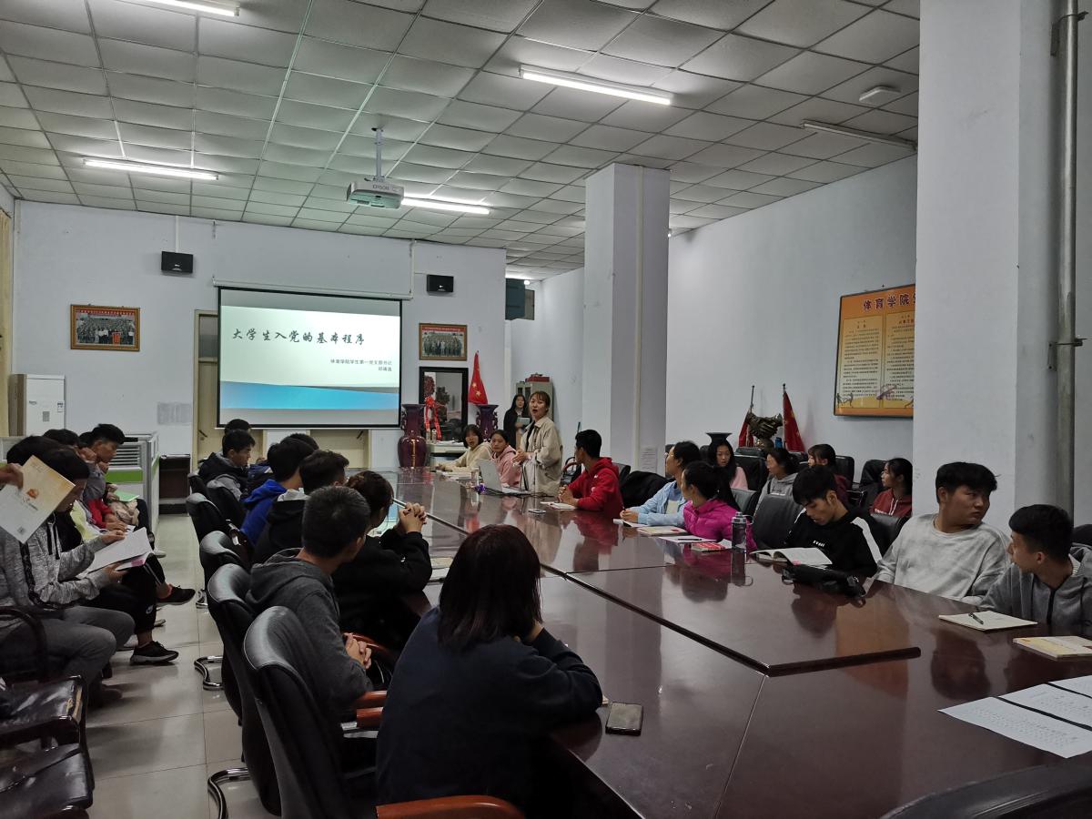 2019年11月6日晚上,在体育学院办公室,我院召开了第六十二期分党课培训,培训课程围绕“讲解入党条件、入党程序及党章的学习”进行内容教育学习,由体育学院学生第一党支部书记邱靖逸老师主讲,体育学院全体第六十二期分党课学员参加。