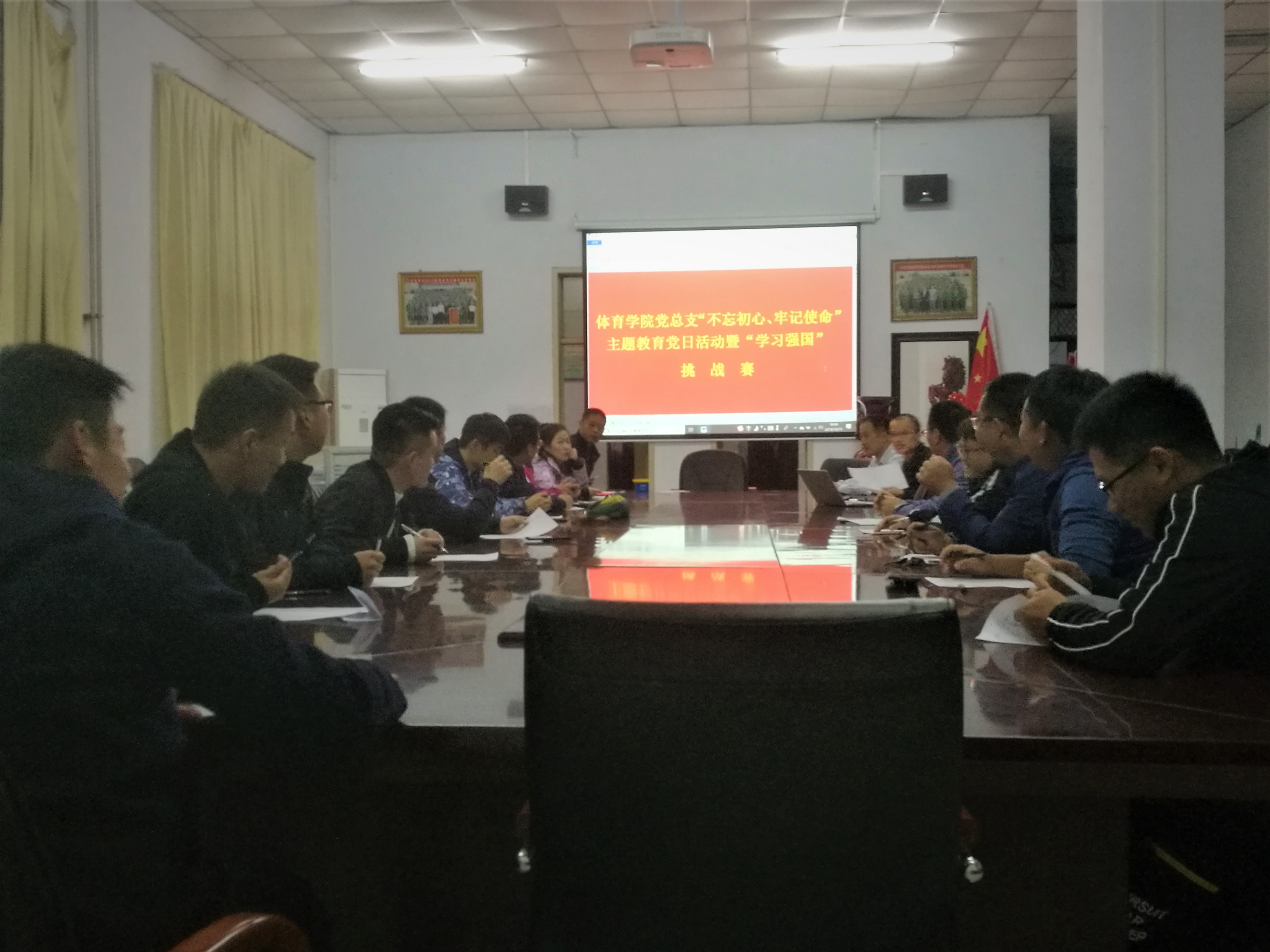 2019年10月15日傍晚6时,在会议室,体育学院党总支利用下班下课时间举行了“不忘初心、牢记使命”主题教育党日活动暨“学习强国”挑战赛,党总支副书记王建民、部分总支委员、支部书记、党建组织员和各支部“学习强国”优秀党员参加了此次活动。党日活动暨挑战赛由党总支副书记王建民主持,具体比赛由党总支“不忘初心、牢记使命”主题教育领导小组办公室主任李国伟和党建组织员负责实施。