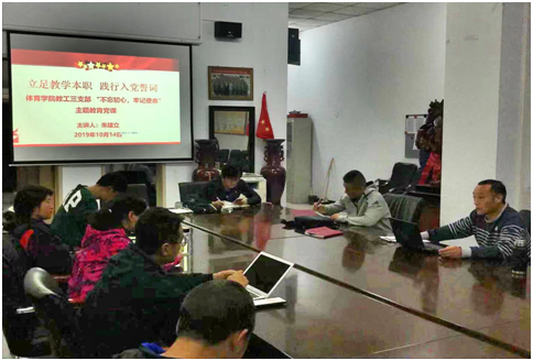 10月14日下午,体育学院教工第三党支部在体育学院会议室开展“不忘初心、牢记使命”主题教育学习,以支部书记上党课形式围绕“立足教学本职,践行入党誓词”作专题学习。