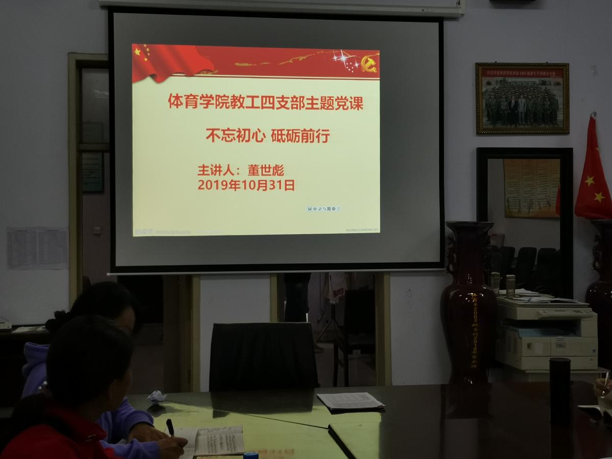 2019年10月31日,体育学院教工第四支部在学院会议室进行集体党课学习,由分管领域的体育学院副院长董世彪为全体党员开展党课学习。主讲题目为《不忘初心,砥砺前行》重点解读教育问题。