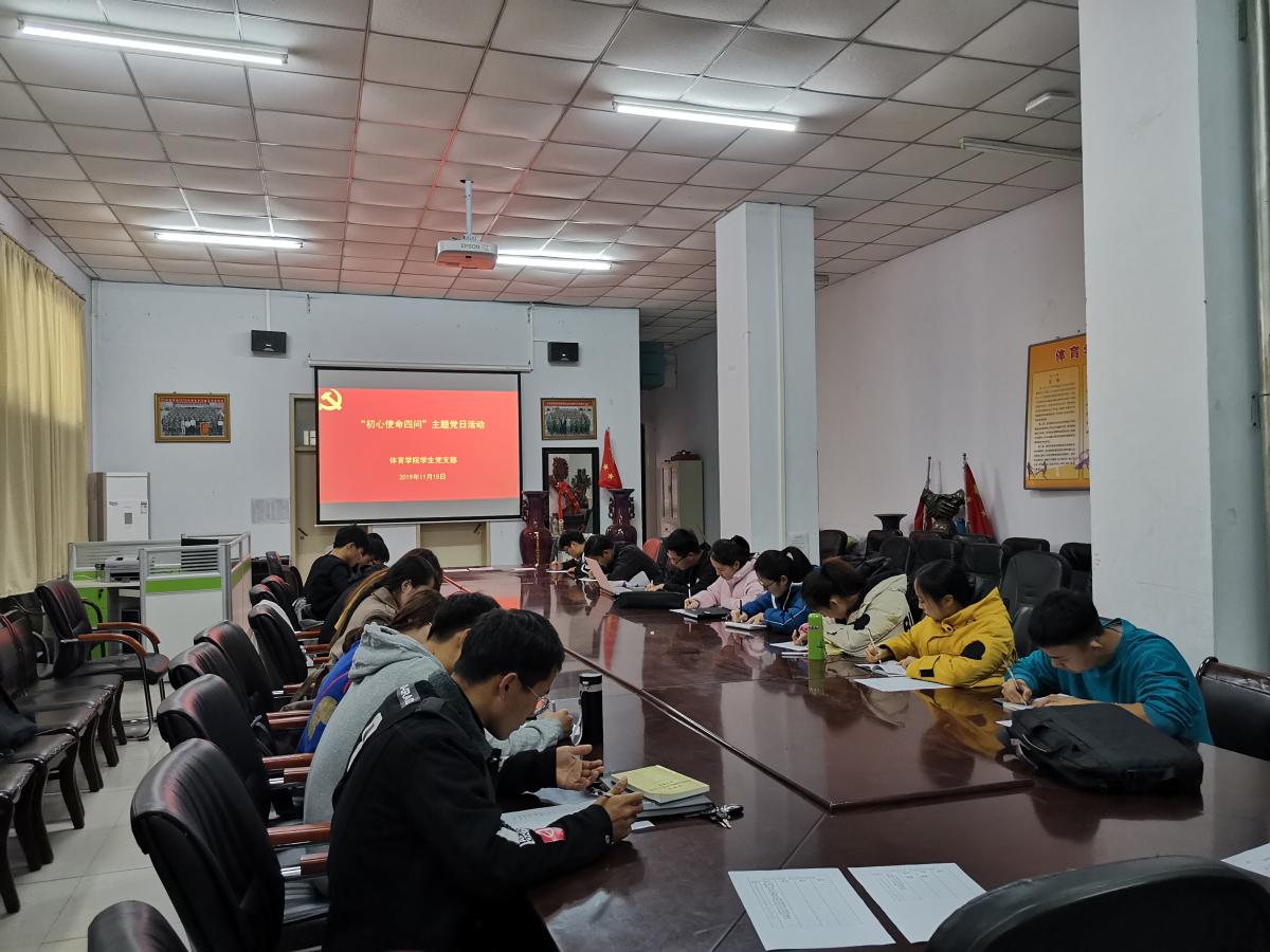 11月15日中午,我院学生第一、二党支部在体育学院办公室组织开展党员“初心使命四问”主题党日活动。会由学生第一党支部副书记黄永胜主持。