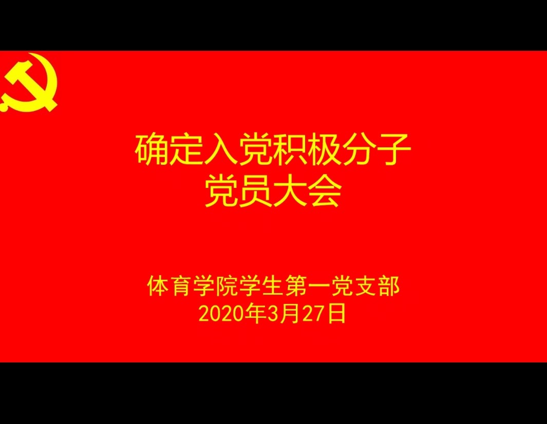 由于疫情原因,2020年3月27日,体育学院利用腾讯会议程序进行了学生第一党支部“确认入党积极分子党员大会”,本次会议是我院进行的第一次此类线上会议,此次会议由体育学院学生第一党支部书记邱靖逸主持,参加此次会议的有学生党支部全体成员和全体入党积极分子。