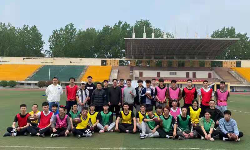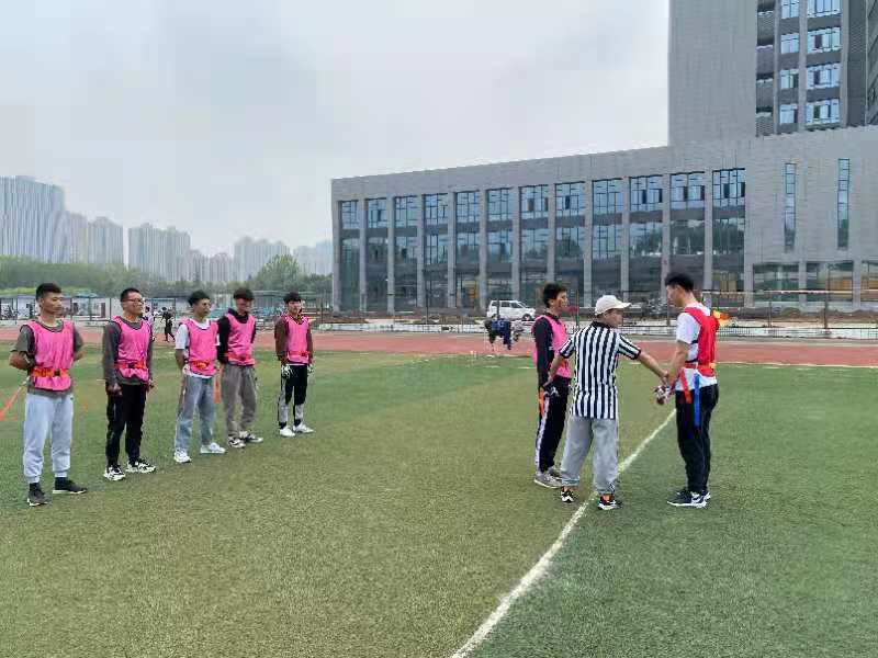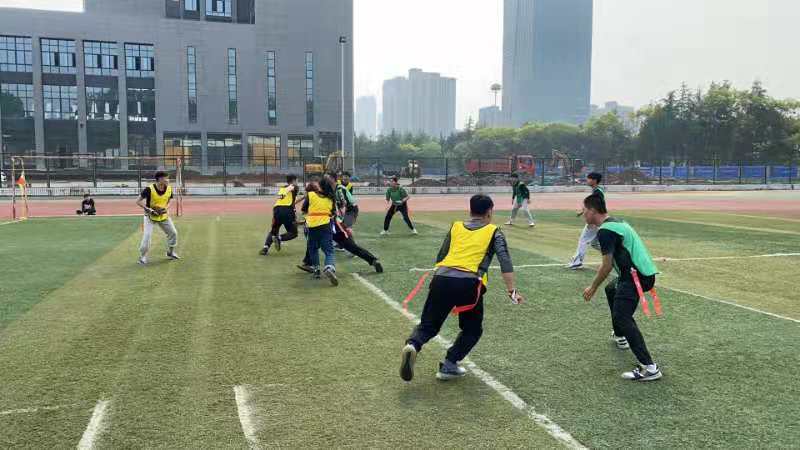 腰旗橄榄球是源于美国国家橄榄球大联盟(NFL)的一项大众化运动,它将美式橄榄球的基础规则和技巧进行修改,将参加对象调整为8-18岁的青少年。与正式橄榄球运动相比,腰旗橄榄球规定不允许抱人和推人,防守方拉下持球进攻球员腰带上的一条腰旗,进攻即被阻止,是一种安全的“非冲撞性”对抗运动,在世界多个国家的青少年中广为流行,国内也形成了多所知名高校组成的运动联盟,我院首次交流赛也达到了预设目的,师生反响较为热烈。