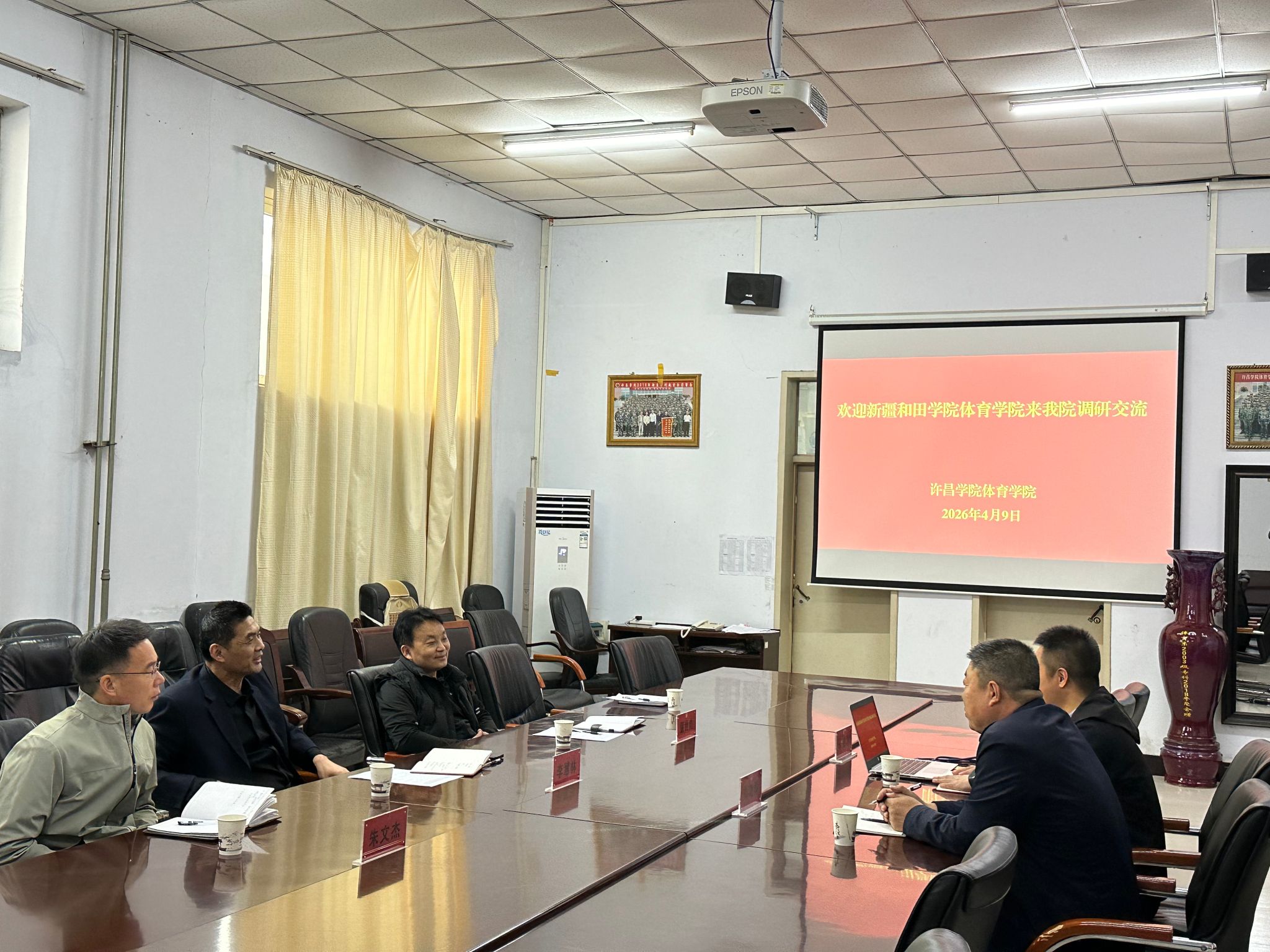 4月9日上午,新疆和田体育学院院长刘艳春、副院长宋会涛到我院调研交流,会议在羽飞田径场看台114室举行。我院院长李慧林、副院长董世彪、副书记朱文杰、教学办公室主任邓永川参加,会议由李慧林主持。