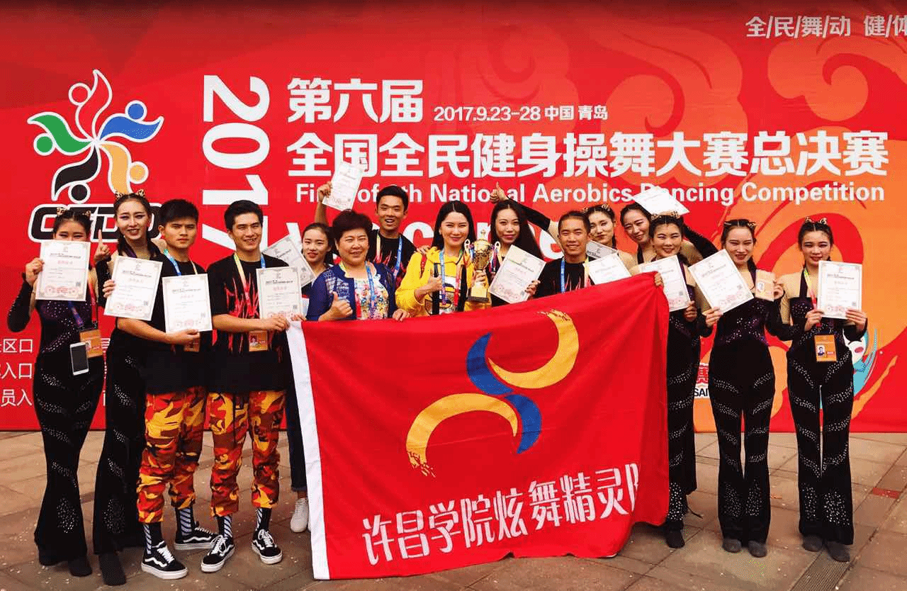 许昌学院体育学院自2004年建队以来,长期刻苦训练,不分严寒酷暑。每年参加各大赛事,战绩辉煌,硕果累累。参加本次全国大赛的队伍大部分由新队员组成,选入操队后由赵晨子、单姗两位教练带领下,自2017年3月开始集中训练,利用周末,暑假等一切可利用的时间,克服高温酷暑,放弃个人活动,秉承团队第一荣誉至上的信念。经过十个月集中训练,最终在本次大赛中,不负众望,一举夺得三冠。