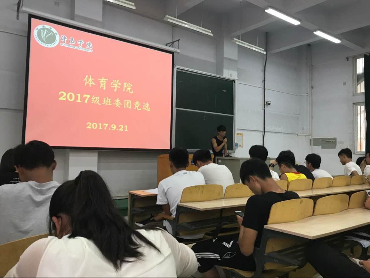 2017年9月21日下午3点40分,许昌学院体育学院2017级新生于A合十八教室进行了大学生活中第一次竞选班委。17级辅导员邱靖逸老师,16级年级长参加本次竞选。参加竞选的学生热情高涨,大家都对自己充满信心。
