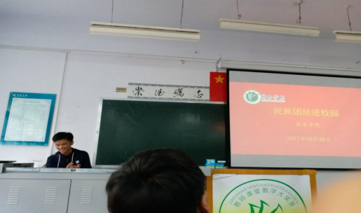 为加强民族团结,提高同学们的学习积极性,体育教育和社会体育与指导管理专业于2017年10月20日成功举行了以“民族团结进校园”的主题的团课活动,17级全体同学参加了此次活动。