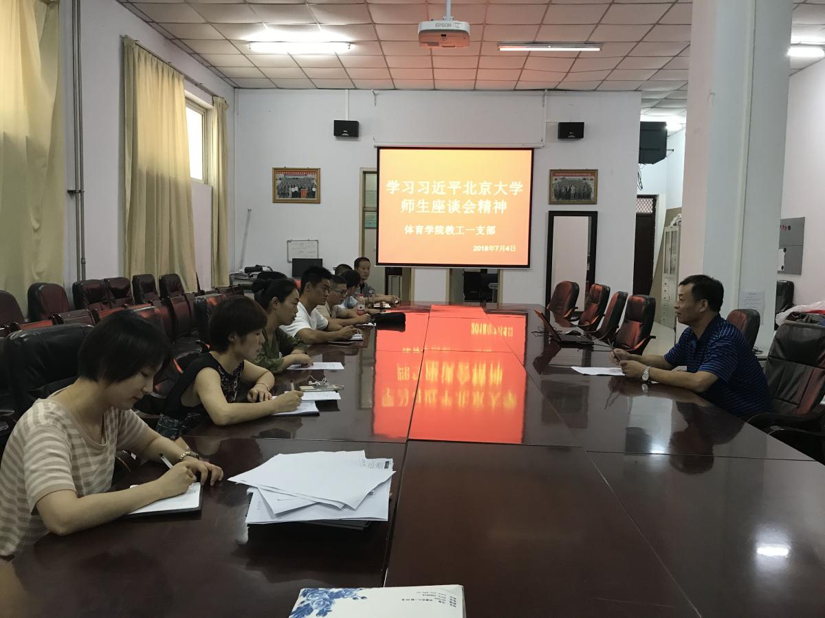 2018年7月4日,体育学院教工一支部党员深入学习贯彻习近平总书记在北京大学师生座谈会上的重要讲话精神。