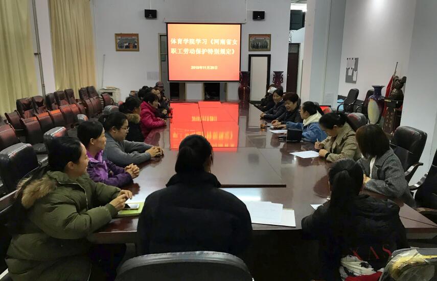 11月29日下午,体育学院在会议室召开全体女教职工会议,组织大家学习《河南省女职工劳动保护特别规定》。