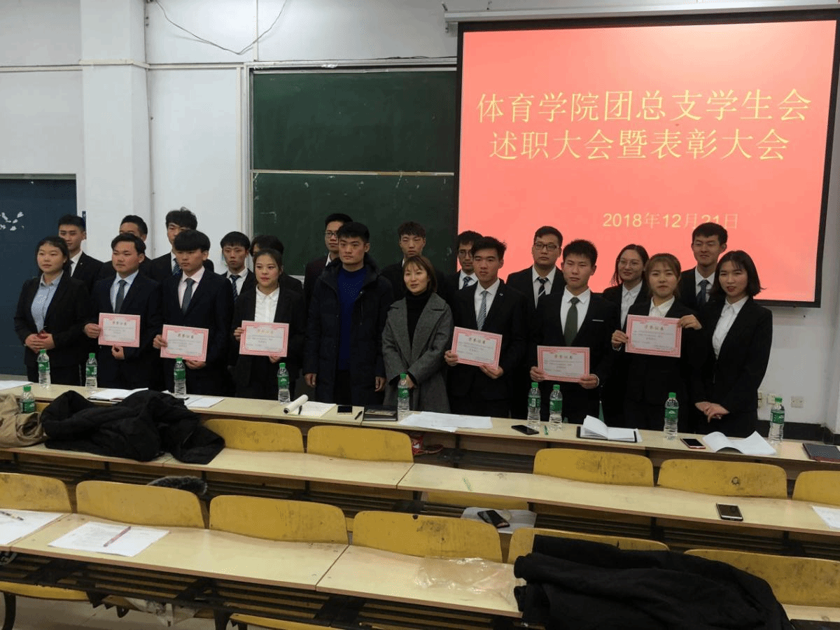 12月21日下午3:20,许昌学院体育学院学生会在蕴韬楼A合四召开述职大会暨表彰大会。17级辅导员邱静逸老师、18级辅导员张亚辉老师、学生会主席团与各部部长副部长及全体干事出席本次会议。
