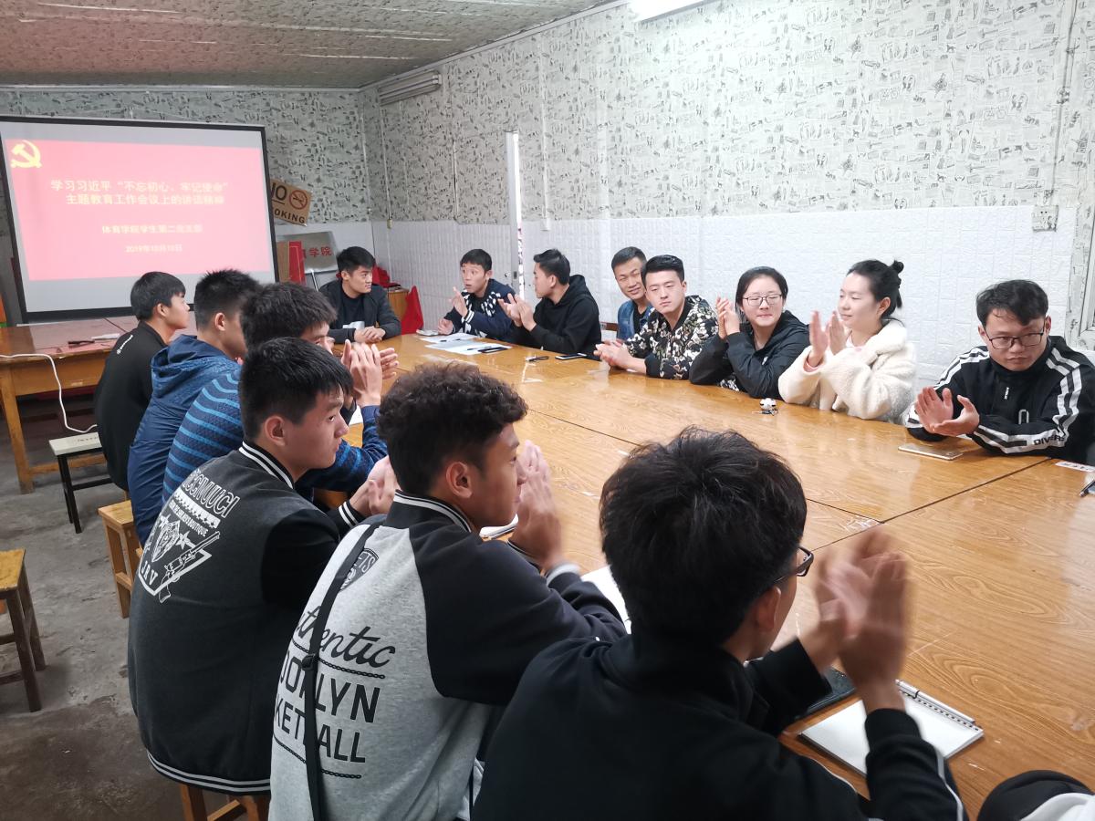 会上,支部成员进行学习讨论,党员卢英豪认为,为中国人民谋幸福,为中华民族谋复兴,是中国共产党人的责任和使命,是激励代代中国共产党人前赴后继、英勇奋斗的根本动力。党员蒋建立认为,作为一名学生党员,要起到模范带头作用,初心和使命是激励我们不断前进的动力,在日常生活和工作中,要时刻牢记党章党规,加强学习,在同学中发挥模范带头作用。