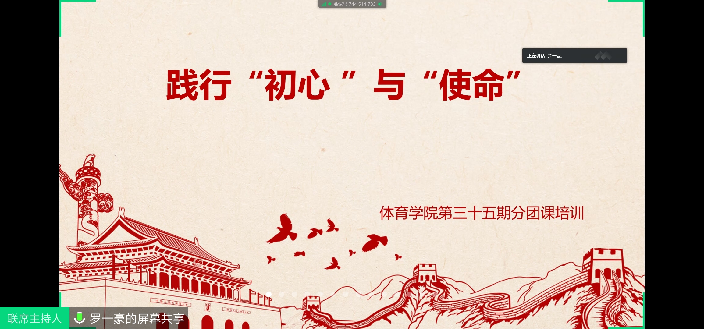 4月11日中午十二点半,我院在线上开展践行“初心”与“使命”主题团课培训,此次团课由体育学院团总支学生会主席罗一豪主持,第三十五期分团课全体学员参加。
