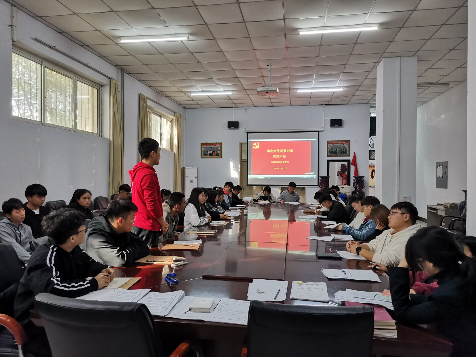 2020年10月21日下午,体育学院学生党支部在体育学院办公室召开确定发展对象党员大会。会议由学生党支部书记邱靖逸主持,学生党支部全体学生党员参加了本次会议。