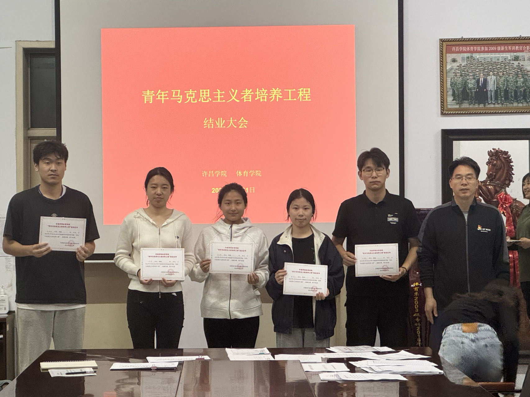 为深入学习宣传贯彻习近平新时代中国特色社会主义思想和党的二十大精神,深入实施青年马克思主义者培养工程,巩固和发展学习成果,动员青马学员明晰使命愿景、焕发精神动力,4月11日,体育学院2023-2024年度“青年马克思主义者培养工程”结业仪式在羽飞田径场体育办公室顺利举行,党委副书记朱文杰、团委副书记刘振坤出席了本次结业仪式,全体青马班成员参加。本次会议由团委副书记刘振坤主持。
