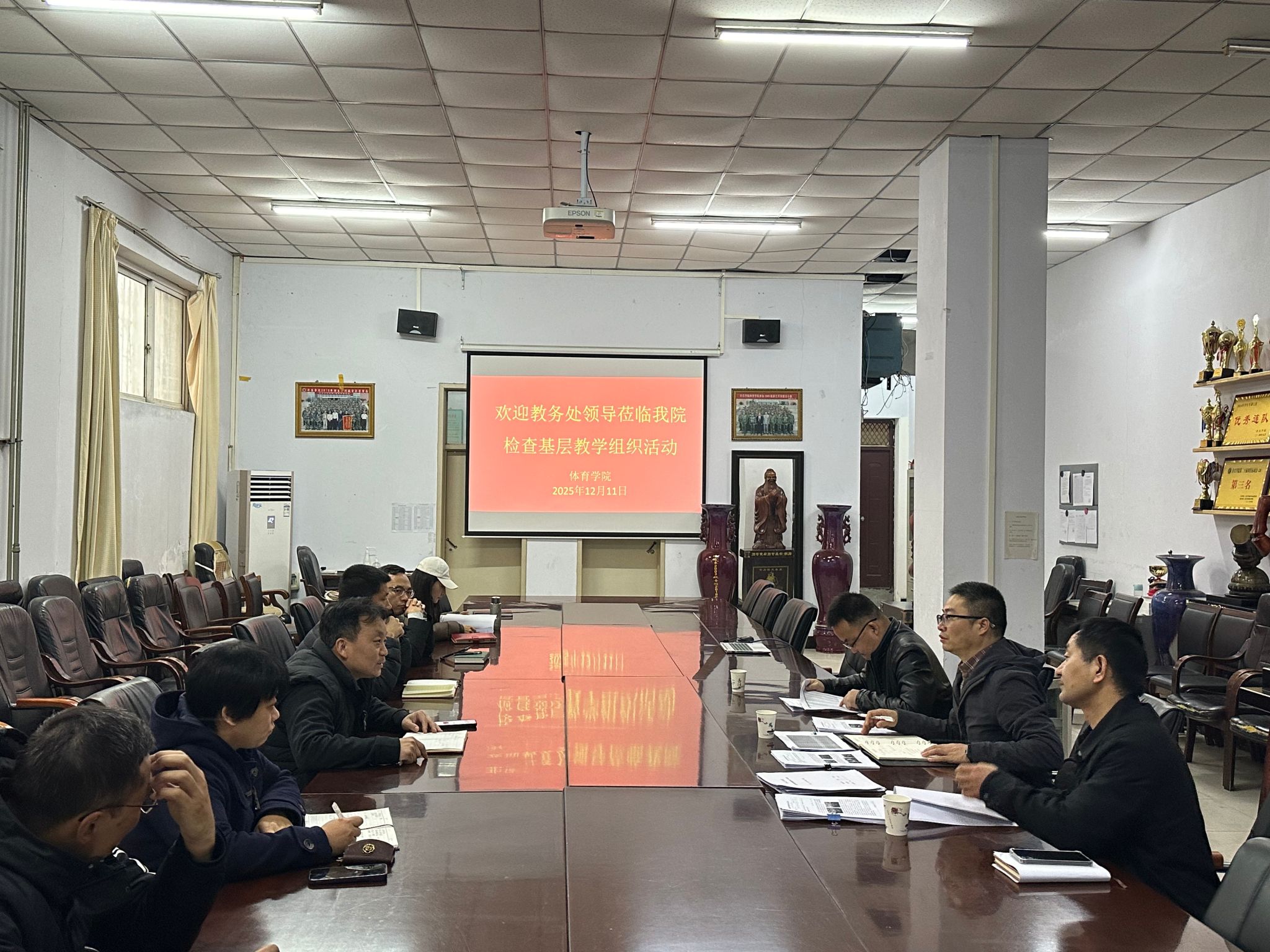 12月11日下午,教务处副处长张成兴一行3人到体育学院检查基层教学组织活动,体育学院副院长董世彪、教学办公室主任邓永川、各教研室主任在会议室114室参加检查活动。