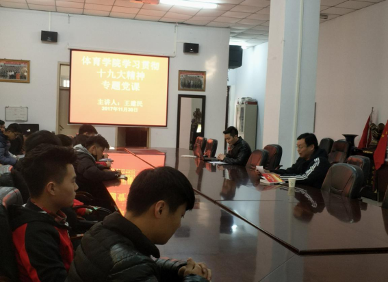 为持续推进党的十九大精神的学习宣传贯彻,2017年11月30日下午我院党总支王建民副书记为体育学院全体学生党员、预备党员及发展对象宣讲关于学习宣传贯彻十九大精神的专题党课,带领广大党员自觉用习近平新时代中国特色社会主义思想武装头脑、指导实践,不忘初心、牢记使命,用青春和激情拥抱新时代、放飞新梦想。