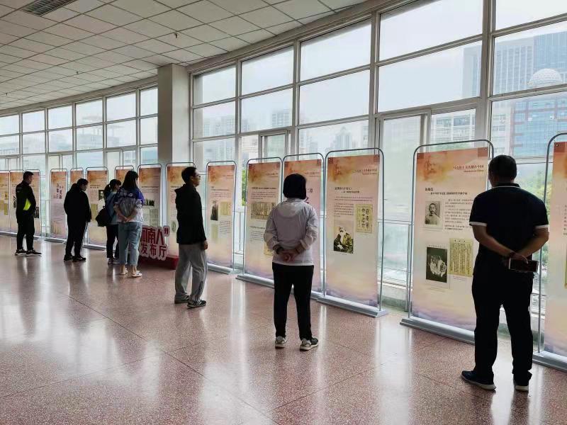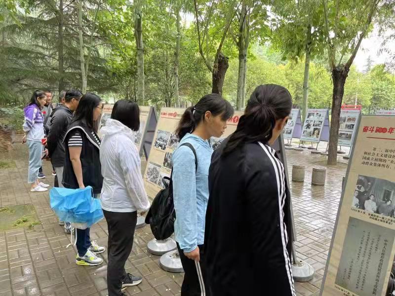 迎着淅淅沥沥的小雨,体院教工三支部党员一行首先来到学校图书馆学术报告厅长廊、二楼大厅,参观了“马克思主义传播在中国”专题展,专题展分为“西学东渐”、“必由之路”、“万象更新”、“劈波斩浪”、“源头活水”、“理论飞跃”六个单元,生动形象地展现了百年来马克思主义在中国的传播历程。