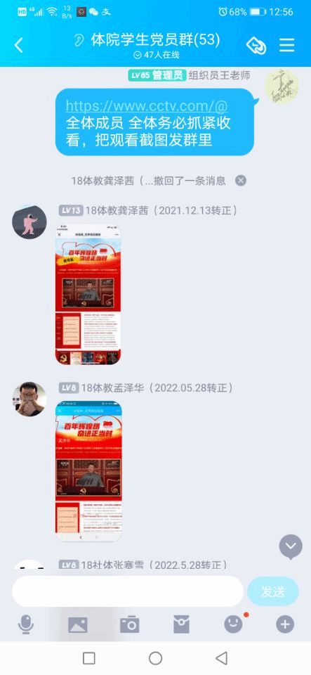 2021年7月1日上午8时,庆祝中国共产党成立100周年大会在天安门广场隆重举行,中央广播电视总台和新华网进行了现场直播。我院党建组织员王军平老师带领学生党员进行了线上观看,并把观看截图发送至群中。