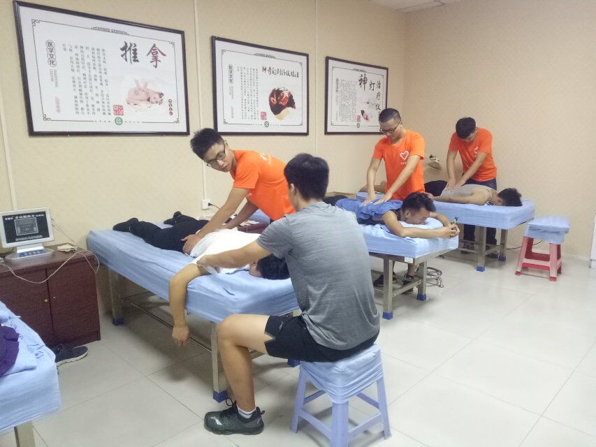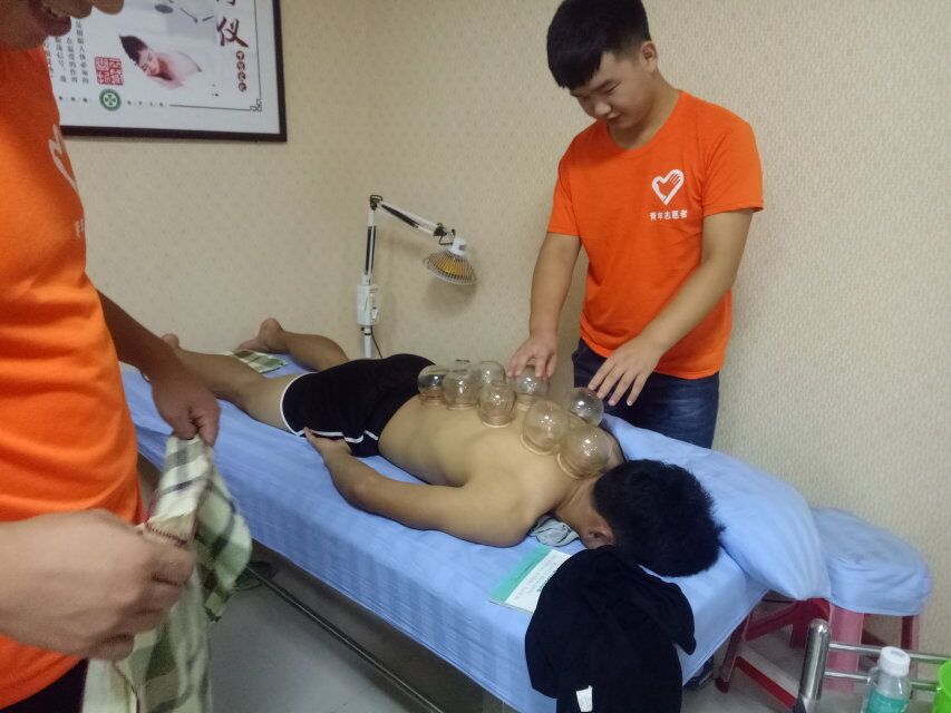 经过了前几天老师的讲解和实操练习,队员们能够独立的为前来国医馆的各种人群分析制订相应的治疗方案,有侧重点的进行按摩,放松,提出一些改善性意见。社会实践团队操作的大多数是刚刚训练完的体育生,他们通过一定的运动,肌肉呈紧张状态,腿部运动激烈,感到腿很疼,身上容易出现酸痛的现象。对于这种现象,队员们着重对他们进行了腿部按摩,在按摩时队员会传授他们腿部按摩的知识,例如:首先要找到位于人体的腘横纹中点,当股二头肌腱与半腱肌肌腱中间的委中穴以及位于脚跟和膝盖间正中央的承山穴,然后用大拇指按摩这两个穴位,通过按摩这两个穴位,可以缓解小腿疲劳,达到放松效果。