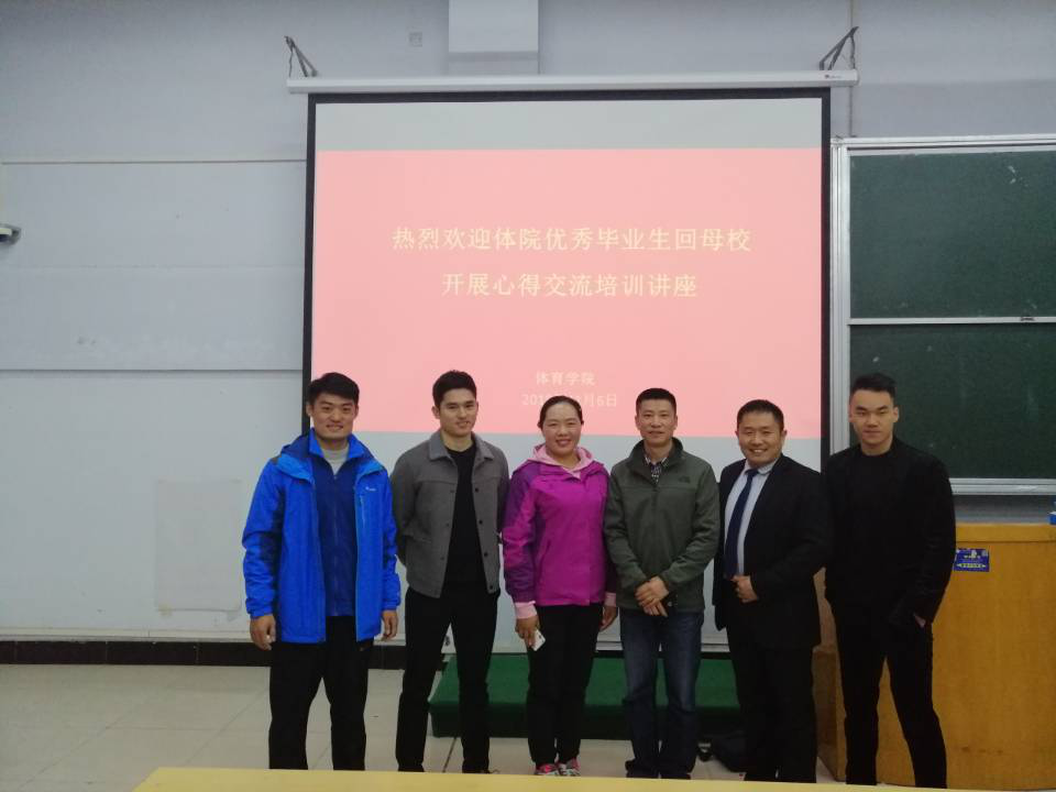 2018年11月6日晚上19:00在A合八教室,我院举办了“体院优秀毕业生回母校开展心得交流培训讲座”,邀请到了河南省教学名师徐虹艳、鹿鸣湖一号物业总经理王景才、乐刻健身俱乐部总经理靳乐及私教总监王照帅,体育学院民传教研室主任刘旭东、2018级辅导员张亚辉。