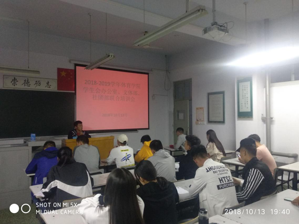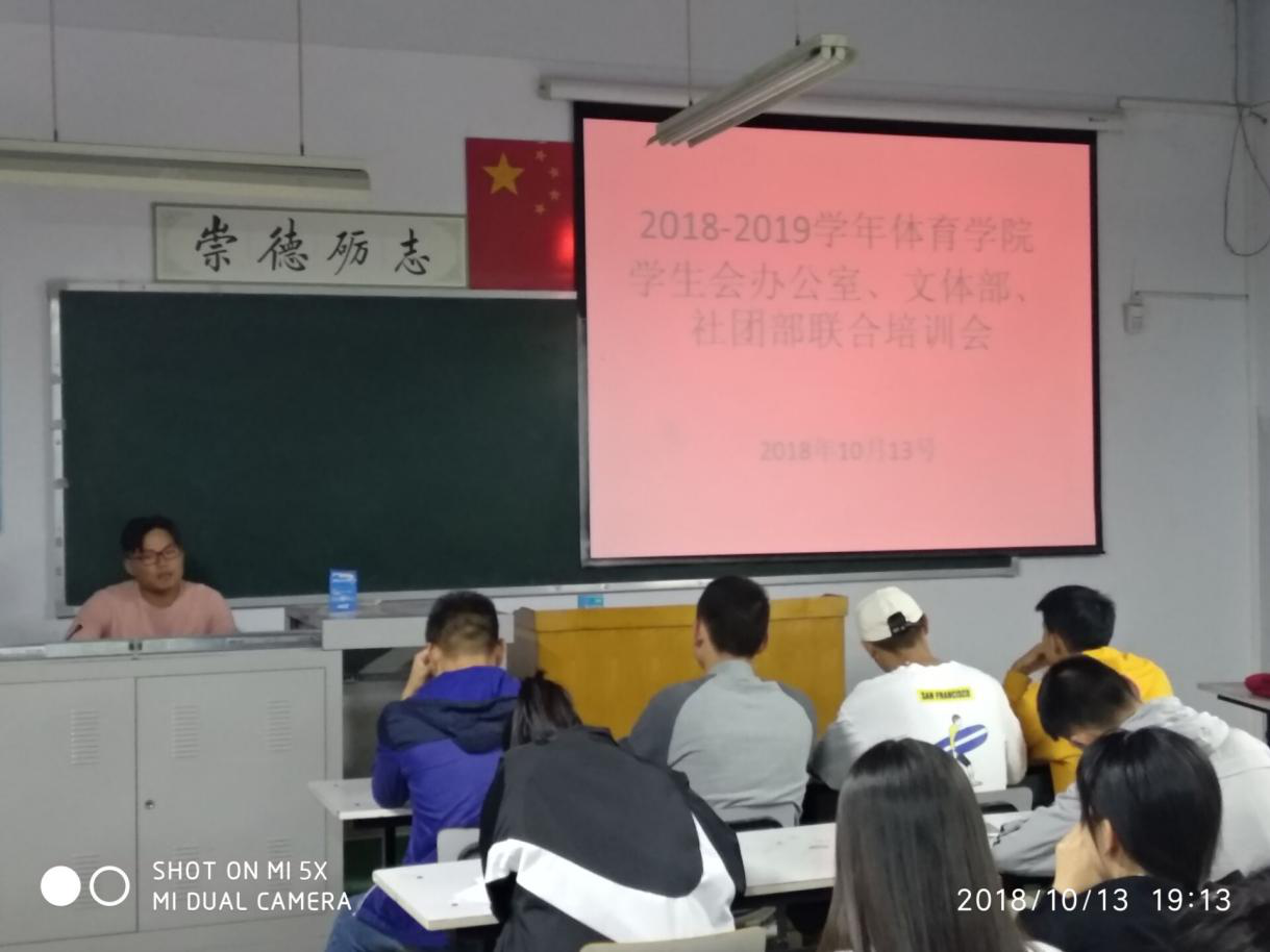 为了能让18级新干事更好的融入学生会的大家庭,使学生会工作的开展更加顺利,体育学院团总支学生会办公室、文体部、社团部于2018年10月13日晚,在B3-104召开了联合培训会。我院学生会尚宁辉主席、卢英豪副主席以及三个部门的全体成员参加本次会议。