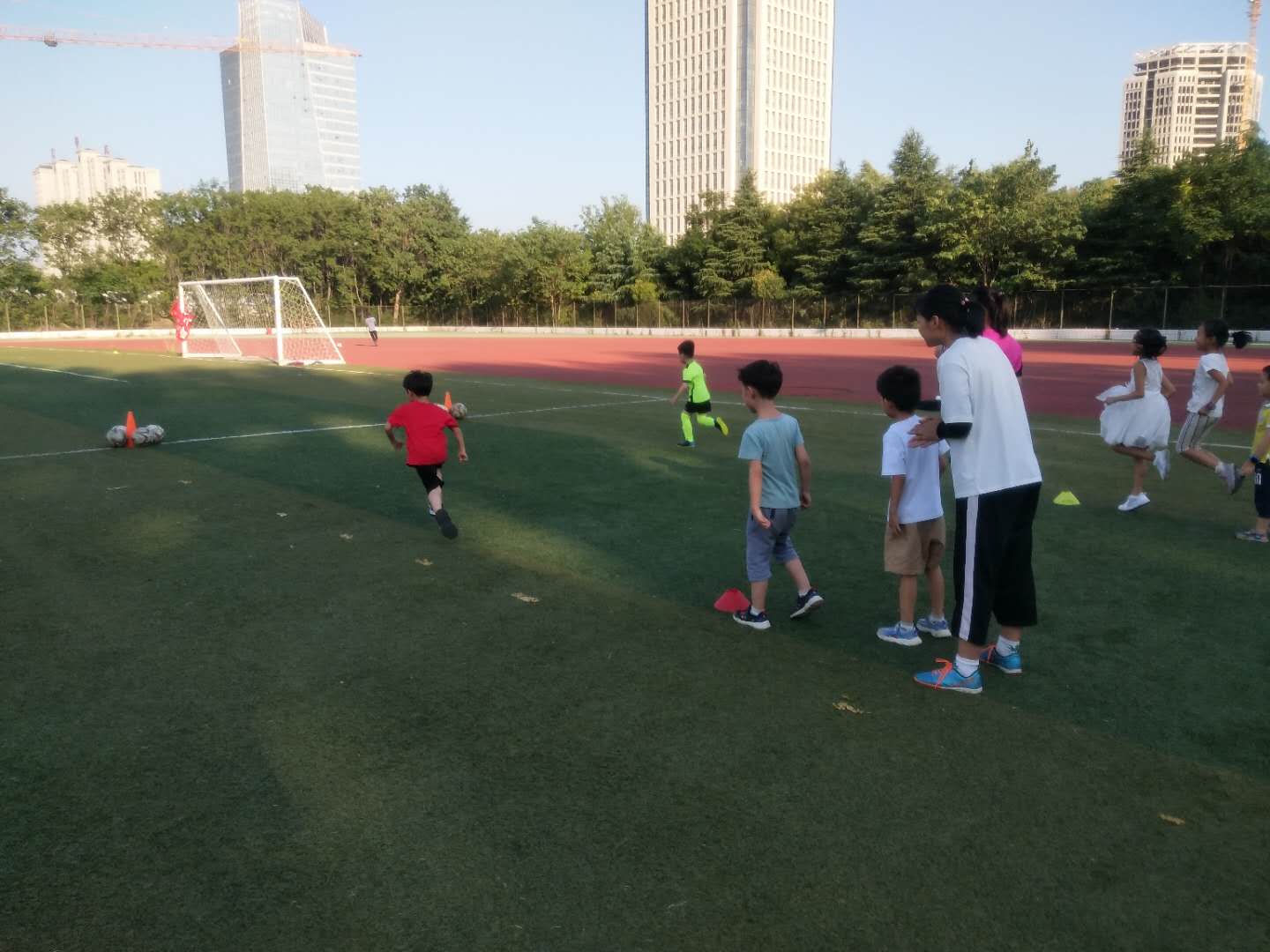 今天的活动分为两项,一项是室内活动,另一项则是室外活动。室内活动主要是向孩子们介绍足球训练时的一些动作要领。比如:正脚背射门〔冲力射球〕要点:起跑点,皮球和目标应成一直线,膝向目标轻松助跑,球后身体势追前完成整个射门动作。室外活动主要是将教练之前讲的理论知识付诸于实践。在开展活动之前还做了一些课前热身训练,在操场上,教练严格规范地教导,孩子们用心用力地去学每一个动作,每一个颠球、传球、踢球的脚法。大家头顶烈日,汗流浃背,那种酣畅淋漓无比爽快。