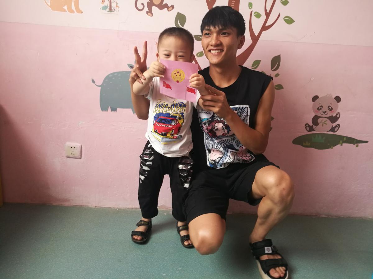 天气非常的闷热,但志愿者们还是如约来到了蓝天康复中心,与这里可爱的孩子们相见,志愿者按照以前分好的名单,各自坐在自己照看的孩子身旁。今天老师安排小孩子们做手工作业,关于70年建国向党致敬。小孩子们都高兴的鼓起掌来,在老师发放完彩纸后,志愿者们和孩子就一起做起了手工,其中一个小组做的手工作业非常出色,得到了老师的表扬,老师还给做好手工作业的小组拍照留念,照片上,志愿者们和孩子举着自己的手工作品笑脸洋溢。一名小朋友抱着自己的手工作品笑着对老师说要带回家给自己的妈妈看。下午五点,各位家长接小朋友们回家,本次社会实践工作活动结束。
