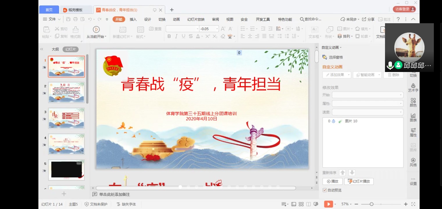 “青年一代有理想、有担当、有本领,国家就有前途,民族就有希望”。为了贯彻落实习近平总书记对青年提出的殷勤希望,激发青年学生的爱党爱国情怀,更好地承担青年学生在新时代的责任与担当,引导青年学生坚定不移的听党话、跟党走,共同实现中国梦。4月10日,体育学院开展了“青春战疫,青年担当”线上主题团课。