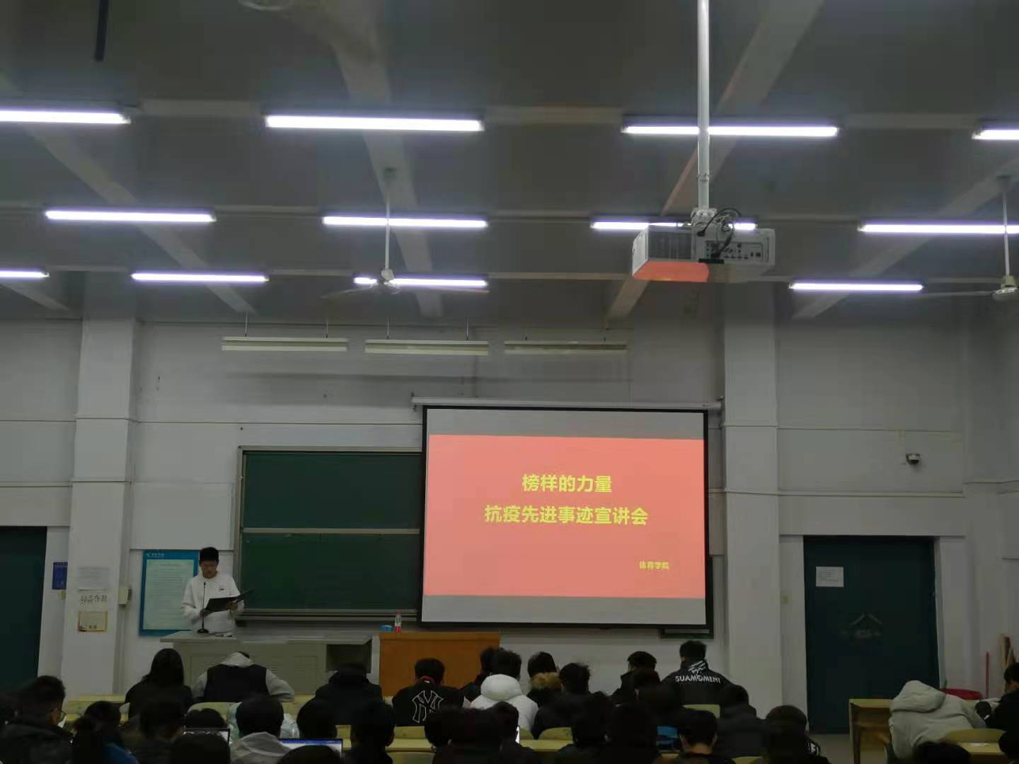 为进一步弘扬不惧险阻逆行而上的抗疫精神,强化学生责任意识,为其树立正确的价值导向,积极引导学生投身志愿服务,12月13日晚,我院在B合五召开榜样的力量抗疫精神先进事迹宣讲会。此次会议由2017级赵旭同学主讲进行,体育学院2020级全体学生参加。
