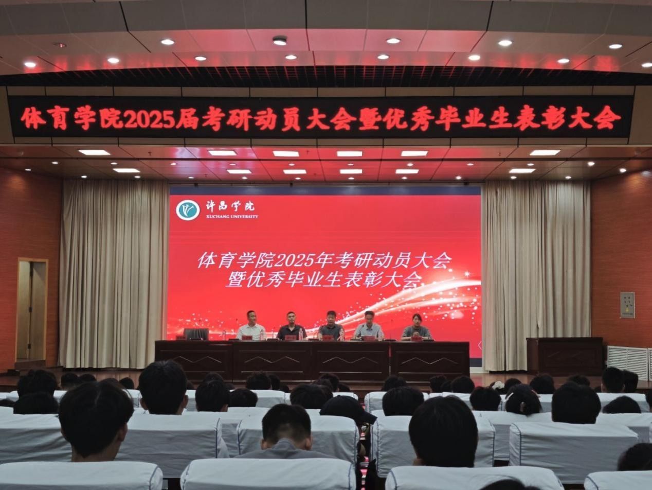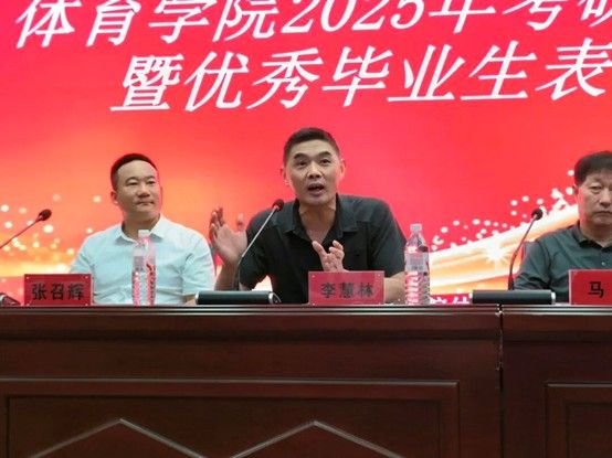 为表彰先进、树立榜样,激发全院学子考研热情,6月5日晚,体育学院于图书馆二楼学术报告厅隆重举行2025年考研动员大会暨优秀毕业生表彰大会。学院党委书记马忠、院长李慧林、党委副书记朱文杰、团委书记刘振坤等领导老师以及优秀毕业生代表张召辉出席大会。
