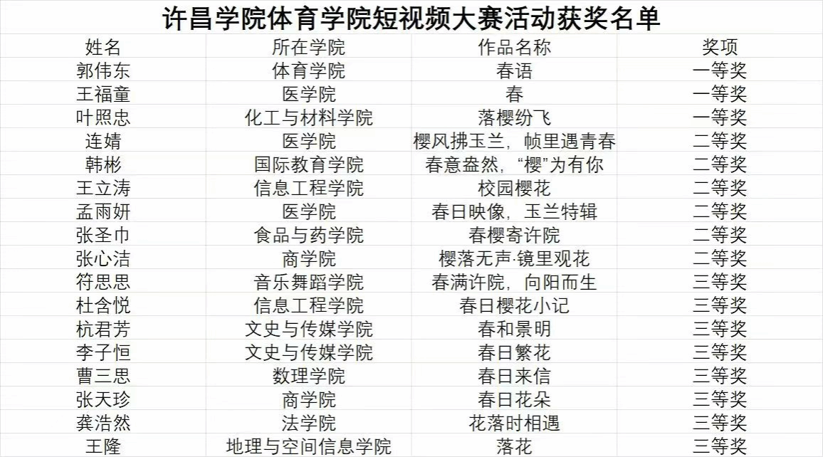 本次大赛以樱花美景为创作核心,不限专业,面向全校学生征集原创视频作品。参赛同学围绕樱花季校园景致、青春校园生活、个人成长感悟等方向展开创作,作品形式多样、内容丰富,涵盖校园风光记录、青春故事演绎、创意短片等多个类别,充分展现许院学子的创作热情与审美素养。