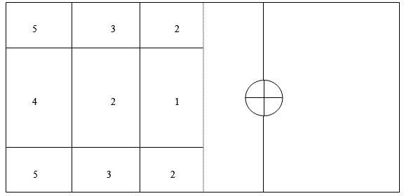 参赛运动员可采用正面上手发球、下手发球、勾手发球中任选一种,站在发球区的固定位置上,连续发球10次,球落入对面场内相应得分区域即得相应分数,累计10次总得分数为最终分数。总得分多者名次靠前,如出现成绩相等,则以单次得分高者名次列前。得分区域划分如下图: