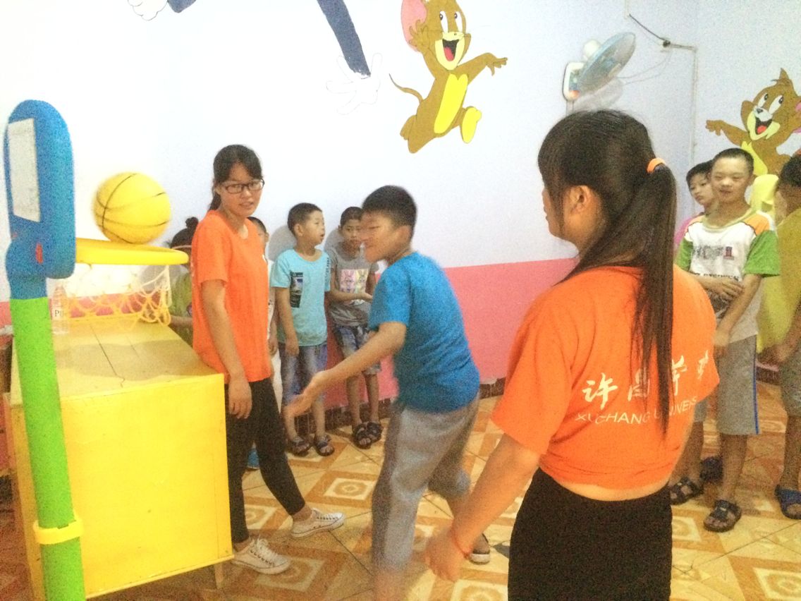 下午队员们带小朋友们到娱乐教室,教他们投篮,一方面可以锻炼他们的身体素质,另一方面也可以锻炼他们的身体协调能力,还可以锻炼他们的反应能力。孩子们的恢复状况是不同的,有的小朋友即使站的很远也是百发百中,而有的连球都拿不住,队员们亲身示范,耐心的教他们,队员们都对孩子们进行了鼓励,使他们对自己充满信心,也愿意去学习投篮,一节课下来,孩子们都有了进步。