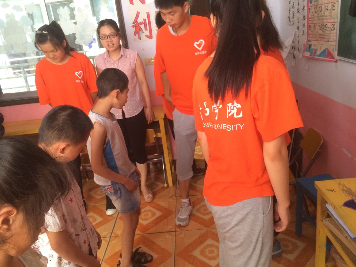 上午八点队员们提前到达教室。康复中心的老师给队员们布置了一项任务:教孩子们广播体操。孩子们从没接触过广播体操,非常兴奋,积极性很高。第一节:踏步运动。双脚在原地踏步,队员们站在孩子们的旁边,亲身示范,并引导他们做。队员们一遍遍的示范,孩子们不厌其烦地跟着做。孩子们都表现的非常好,老师对他们进行了奖励和鼓励。下午队员们带着小朋友对上午所学习的内容进行了复习,他们都很棒。孩子们累了,队员们就陪他们看动画。