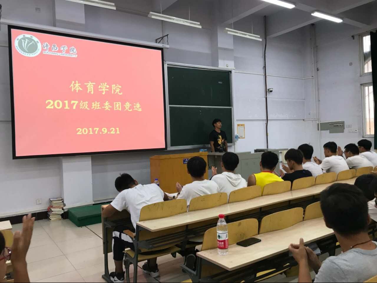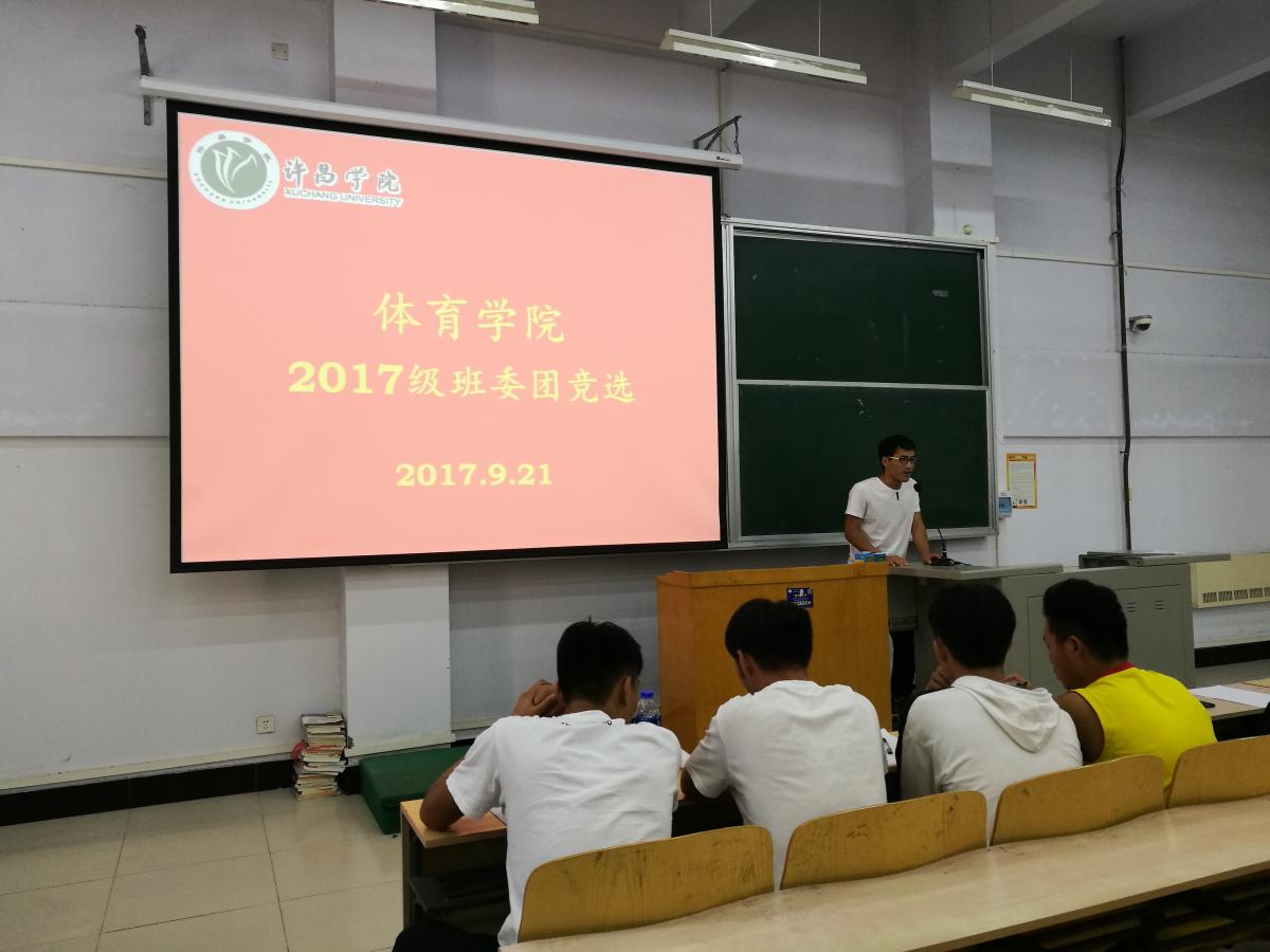 2017年9月21日下午3点40分,许昌学院体育学院2017级新生于A合十八教室进行了大学生活中第一次竞选班委。17级辅导员邱靖逸老师,16级年级长参加本次竞选。参加竞选的学生热情高涨,大家都对自己充满信心。
