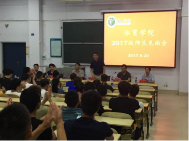 2017年9月20日晚6点整,在刚刚结束新生军训的这个日子里,我们体育学院2017级新生又开始与以后的老师进行见面。本次见面会出席的领导有体育学院党总支书记,李明生教授,体育学院院长,李慧林教授,体育学院副院长,吴洁;体育学院副院长,董世彪;体育学院副院长,朱文杰;各教研室主任及任课老师,团总支书记即16级辅导员陈丹老师,14级辅导员,候凯老师,15级辅导员商银行老师,17级辅导员邱靖逸老师。