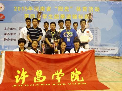 我校是第一次组队参加河南省学生跆拳道锦标赛,成绩的取得实属艰辛。本次大赛由体育学院院长李明生担任领队,“民族传统体育教研室”董世彪、刘旭东、刘朝生3名教师组成教练组,共选拔出9名学生参加比赛。参赛师生从2015年3月初开始利用业余时间进行赛前强化训练,大伙持之以恒苦练素质,狠抓细节和基础;比赛期间,体育学院发扬了体育人奋勇拼搏、团结一致的精神,教练组和参赛学生团结一致、不畏强敌、敢打敢拼,在与河南大学、郑州大学、河南师范大学等强手的比拼中表现出色,其中闫亚辉夺得了男子乙组80公斤级金牌、胡士明夺得了乙组男子58公斤级银牌,其他选手也各有收获,夺得了3个第三名、4个第五名。