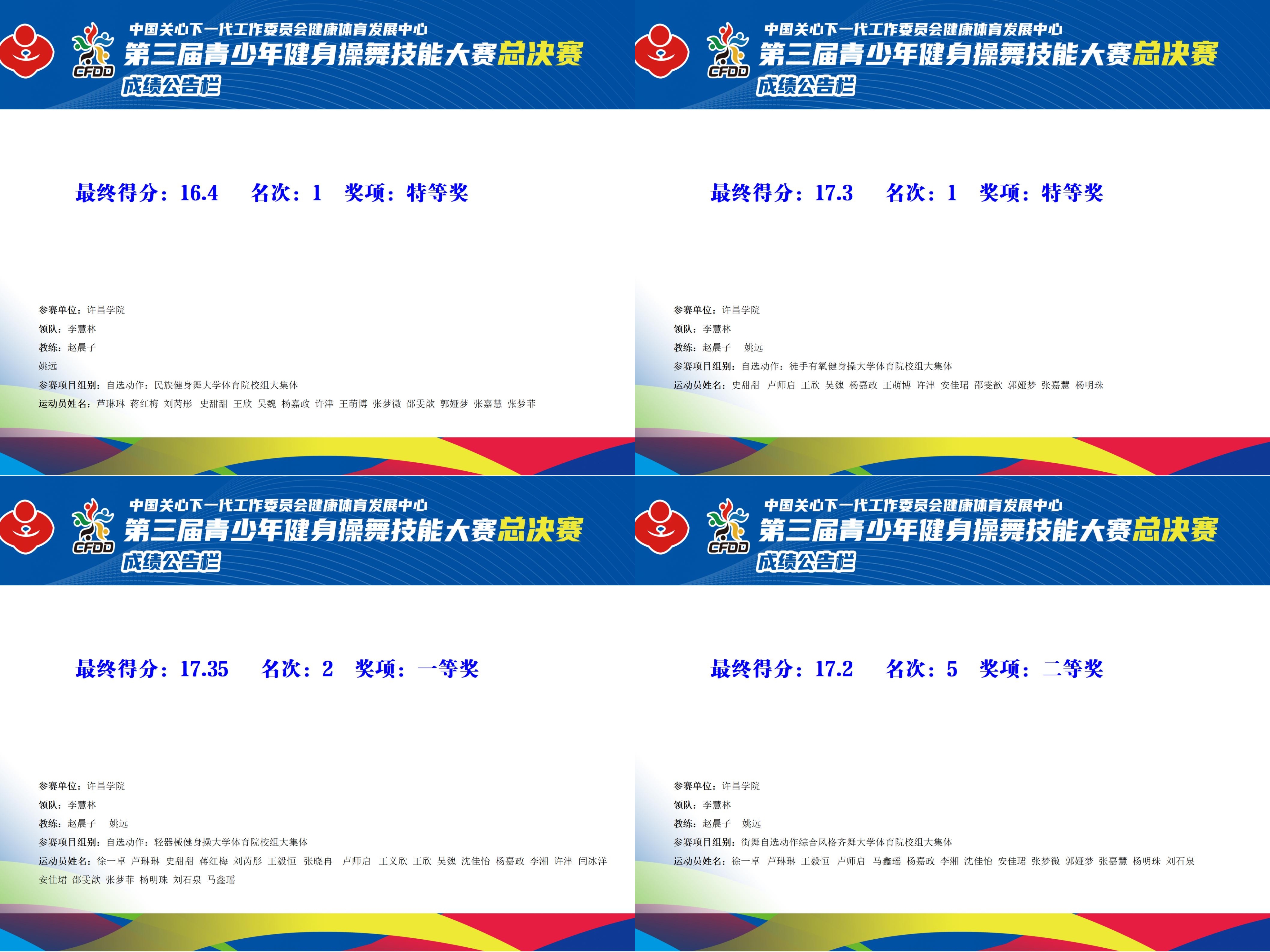 比赛中,我院代表队以优美的舞姿、高质量的动作、灿烂的笑容赢得了裁判员和观众们的一致好评,最终获得了民族健身舞大学体育院校组大集体项目特等奖,徒手有氧健身操大学体育院校组大集体项目特等奖,轻器械健身操大学体育院校组大集体项目冠军,街舞自选动作综合风格齐舞大学体育院校组大集体项目亚军,这些成绩的取得,离不开校院领导和两位指导老师的辛苦指导与栽培。本次比赛拓展了同学们的眼界,丰富了同学们的比赛经验,为争取下一次在比赛中获得更加优异的成绩打下来良好的基础。
