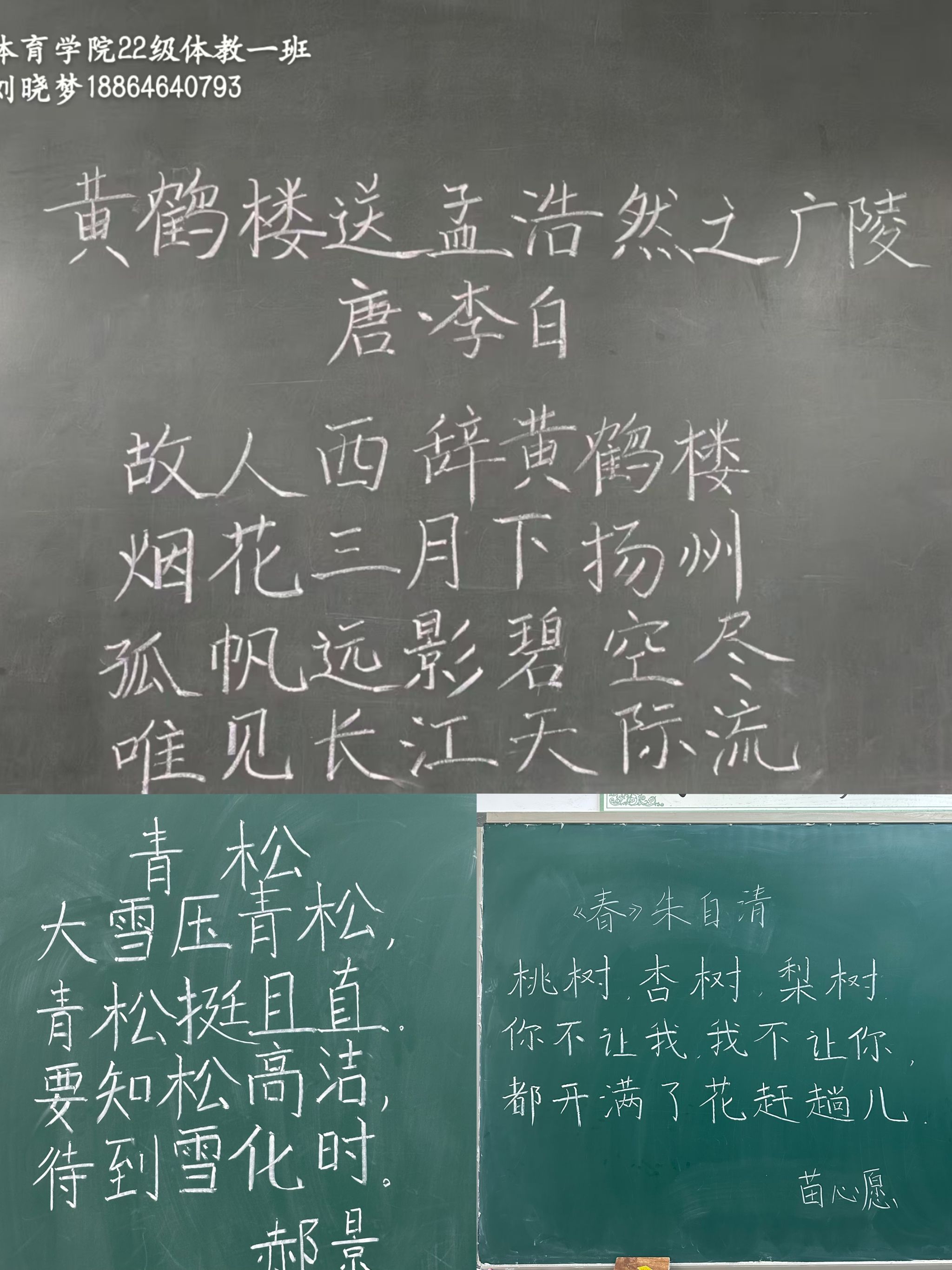 比赛前,邓永川宣读了本次比赛的规则,学生以现场创作的方式进行;提交内容是经典诗词或古今散文,字数控制在70字以内一幅楷体字体粉笔字作品;参赛选手通过现场抽签的方式决定比赛顺序。比赛正式开始,同学们个个跃跃欲试,自信满满,第一位登上讲台的是24级苗心愿同学,她以朱自清《春》进行创作,她在台上表现从容自信,不慌不忙,下笔有劲,布局疏密有致,字迹工整,彰显青春朝气;22级刘晓梦同学以李白《黄鹤楼送孟浩然之广陵》为创作,运笔过程中,她注重粉笔三指虚握,充分利用指力和腕力,做到开始顿笔,提笔、行笔、注重捻转、变化自然,笔笔写得到位,整个字迹行如流水,表现出不错的粉笔字书写功底。截止下午6:20分,我院参赛选手全部完成了既定比赛,经过评委的现场打分,作品评选,最终推荐雍雪等15名同学参加学校粉笔字复赛。